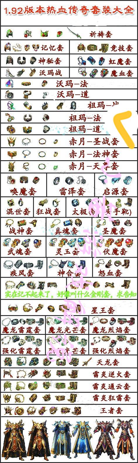 今天给大家分享热血传奇1.80版本之前的套装大全,由于大部分的传奇玩家的记忆都是在1.76版本以前,之后的私服版本太多数不胜数,1.76以后热血传奇开启了变态氪金之路,导致大部分玩家撤离,但是很多人还记得,沃玛套,祖玛套,赤月套,雷霆套,但后面的都知道的很少,紧接着后面还有星王套,狂战套,雷炎逆火套,狂雷套,通云套,后面还有王者套,到了王者套是一个坎,以后就是金牛套,虎威套等等了。这也是传奇的一个节点,到了1.92版本之后就更更更变态。