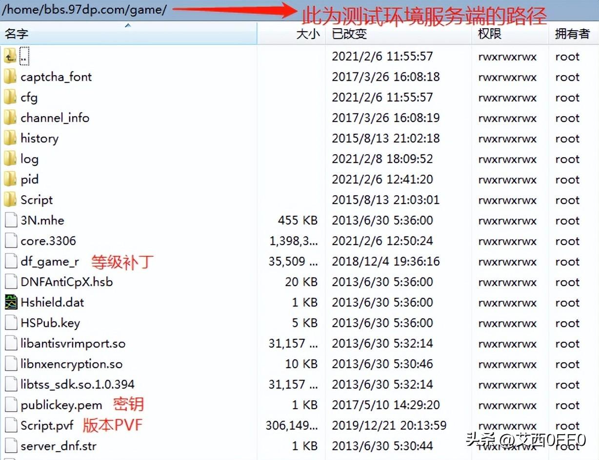 根据各自服务端寻找对应路径上传文件(等级补丁、密钥、版本PVF),并选中三个文件鼠标右键→属性→给0777权限
