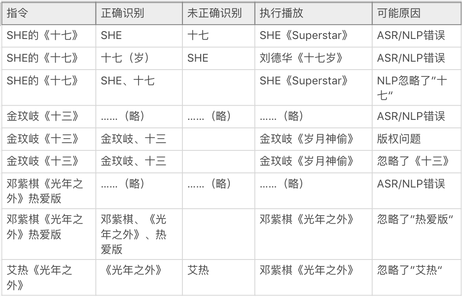 问题1:当播放音乐的语音指令有2到3个甚至多个约束条件的时候,DuerOS有时会回应错误问题2:即使用户”字正腔圆、咬牙切齿“的反复重复同一条指令,DuerOS仍会在多个错误回应之间循环切换,反复给出错误的回应三、问题可能原因分析