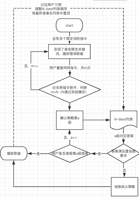 小度:(置信度大于65%小于80%,显性确认)您是希望播放邓紫棋的歌曲《光年之外》现场版吗?用户:不是小度:(置信度大于50%小于65%,显性确认)您是希望播放邓紫棋、华晨宇的歌曲《光年之外》吗?……(置信度递减)//进入消除歧义策略//