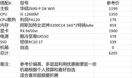 到了这个价位段已经能保证一个比较均衡全面的搭配了,同时也是有足够的预算给到5800X3D这款非常适合网游的CPU。搭配5 会更侧重CPU性能,适合玩网游居多,显卡介意二手可以换6500xt,参考价999。搭配6 则是更侧重显卡性能,适合网游单机55开或者玩单机更多同时这两块主板都有多的PCIE * 4以上的接口(可安装独立声卡,转接安装更多的SSD或者傲腾等,关于傲腾上文已经单独介绍啦)