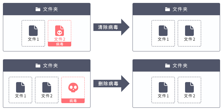 根据前期的分类工作,可以发现一部分病毒能独立传播、作恶,因此识别后直接查杀即可,这样的方式叫删除病毒;还有一些病毒如同寄居蟹寄宿在用户的文件、程序上,如果暴力删除很有可能连同文件、程序一并删除,造成误删、损坏文件的结果,此时就要使用清除的方式——只将附着在正常文件上的病毒去除,不破坏文件。