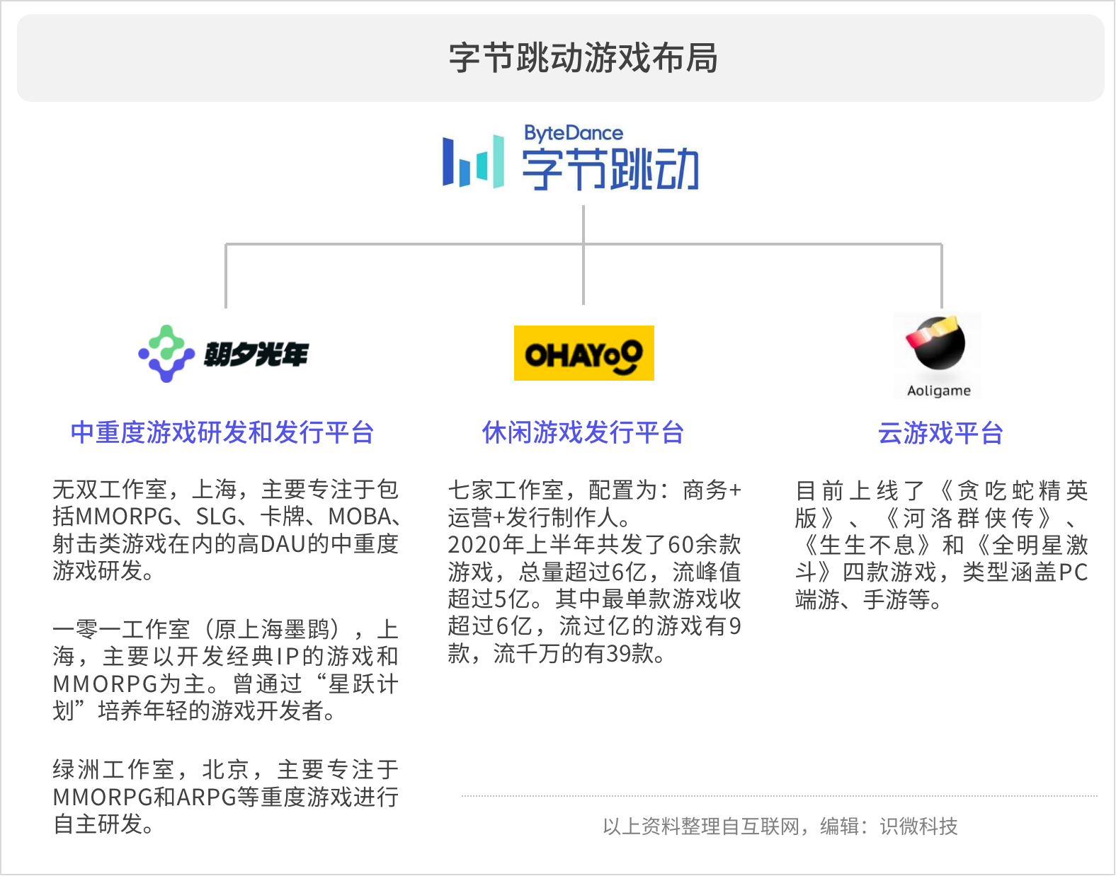 字节跳动通过朝夕光年发行了多款中重度游戏,但其游戏发行平台并不局限于此,还包括:休闲游戏发行平台Ohayoo、独立游戏发行商 Pixmain、云游戏平台嗷哩游戏等4大发行平台 。