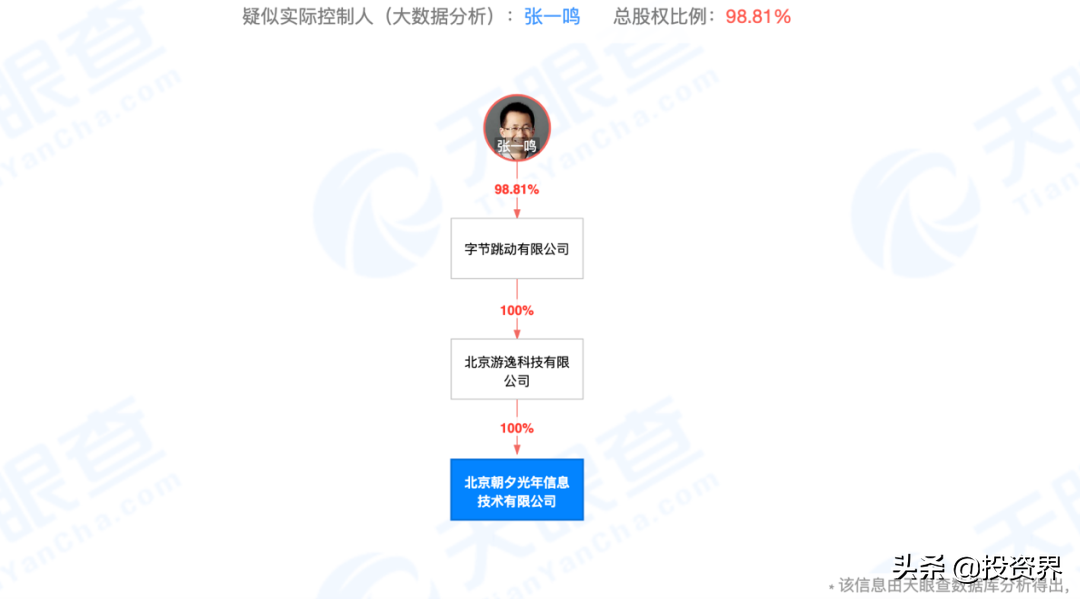 朝夕光年,向来是字节跳动游戏业务的重要操手。天眼查显示,北京朝夕光年信息技术有限公司成立于2013年,现任法定代表人是字节跳动副总裁、游戏业务负责人严授,股权穿透信息显示,该公司由字节跳动全资子公司北京游逸科技有限公司全资持股,疑似实际控制人为张一鸣。