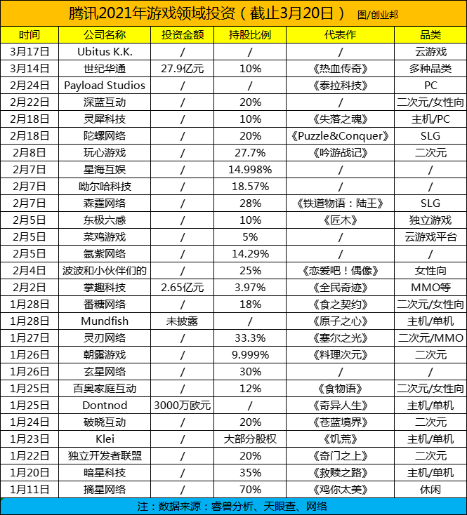 今年前三个月,腾讯投出的27家游戏公司里,有5家是海外公司,3家为上市公司,其余19家均为中小型游戏公司。