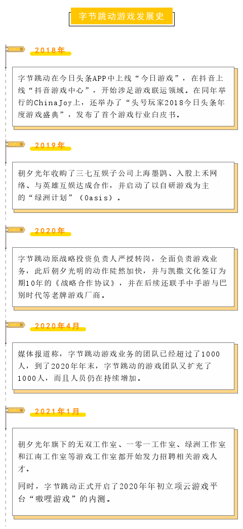 当然,字节跳动也在游戏领域的布局远不止朝夕光年。早在2018年字节跳动就开始做游戏,具体发展历史见下图: