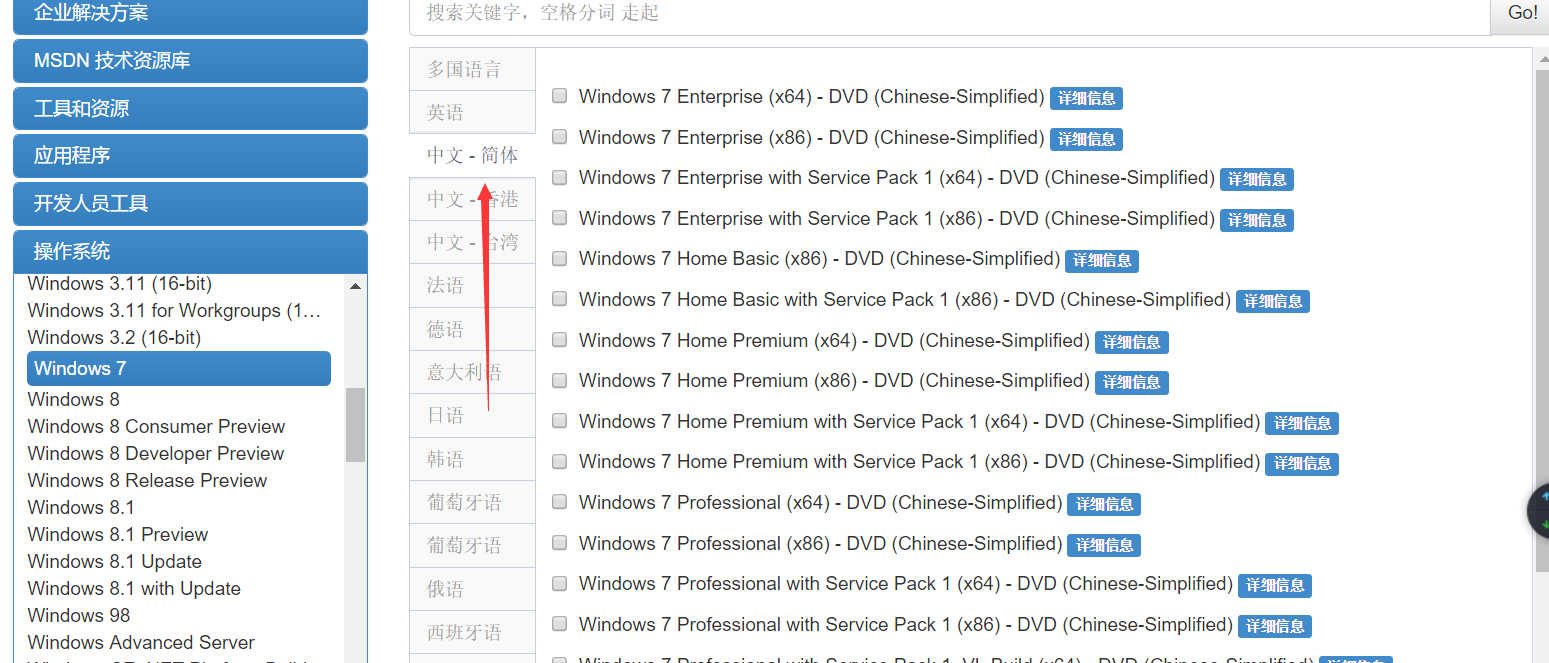 点击展开后,在右侧就可以看到windows 7 ,在里面选择语言版本:中文简体。