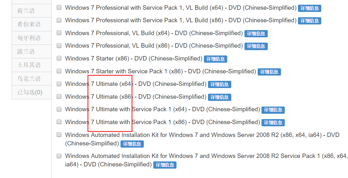选择好语言以后,鼠标下拉在里面找打:windows 7 Ultimate(win7旗舰版),点击详细信息。