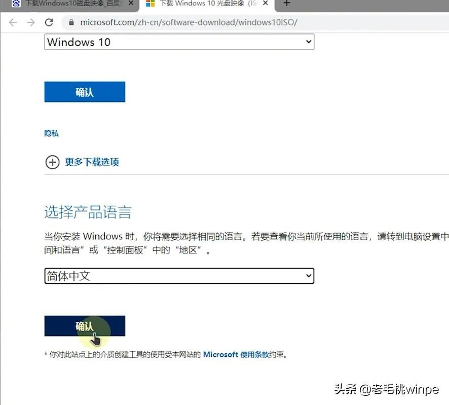 3、下拉网页,选择win10系统版本和语言,点击【下载】。