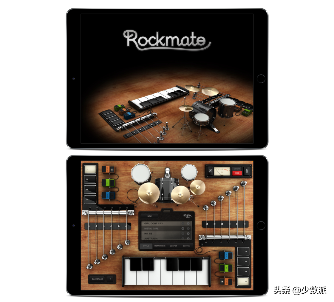 Rockmate 的界面是一张摆放了各类乐器的木质桌面。乐器包括一套架子鼓,两组带有效果器的吉他/贝斯,还有一台带有多种音色的小电钢琴。诚然,在各类数字音乐工作站都能完整在 iPad 上运行的今天,Rockmate 可能显得有些过于简单,但如果你会玩的话,想要用 Rockmate 和朋友们一起创作出一首小 groove 还是完全可以的。
