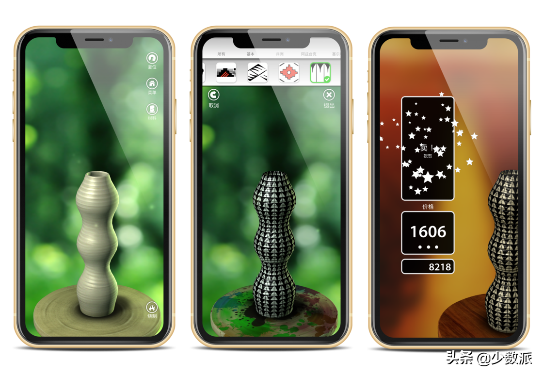 版本 1.0 时间:至少 11 年前最后一次更新时间:3 年前(修复 bug)Pottery 可谓是 App Store 的元老级游戏。在我对 iOS 记忆的起点处,这个从捏制陶土做起的游戏就让我对 iPod touch 灵敏的触控屏幕、鲜艳的色彩,还有立体的音效印象极为深刻。如同早期 App Store 的很多游戏一样,Pottery 在各种边边角角的地方都采用拟物设计,并支持根据不同的设备摆放方式来调整视角,在当时可谓非常精致,搭上了好硬件的顺风车。