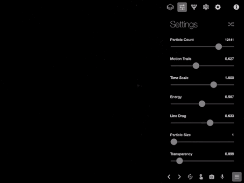 Uzu 完美地展示了 multi-touch 屏幕的特性:在完成配置后,你可以用不同的触摸点数(也就是放在屏幕上的手指数目)来改变粒子的运动形式。这款玩具具有很高的自由度,除了预设的一些配置以外,你也可以利用丰富的菜单选项来创造自己的灯光秀。
