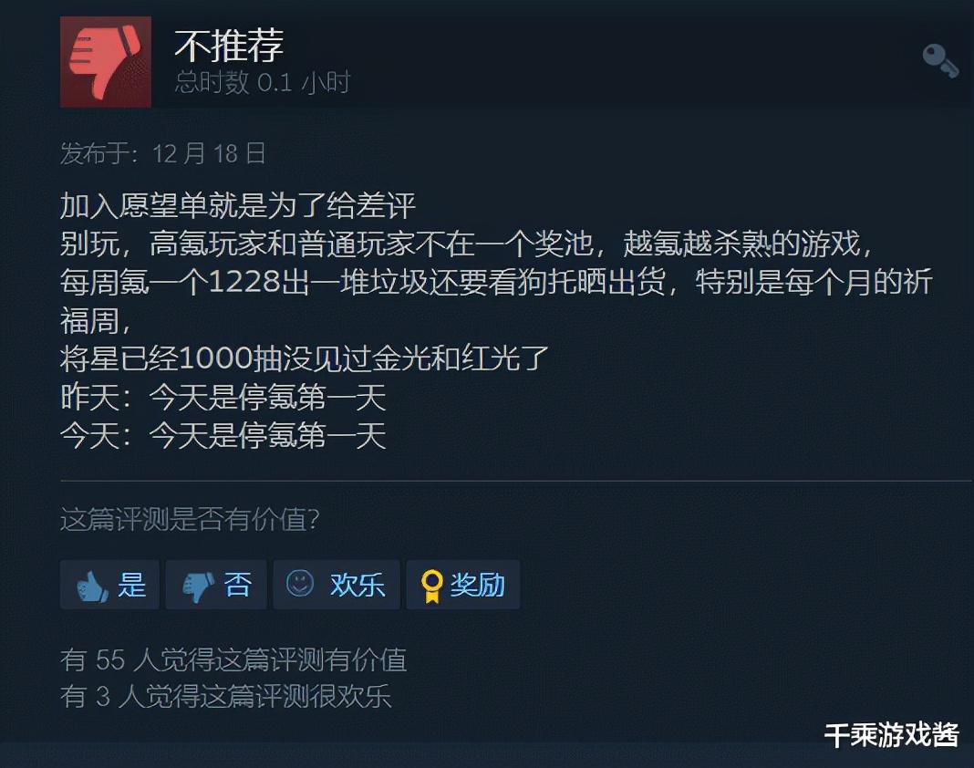 第二点就是玩家们普遍反应,氪金强度太大,大到什么程度呢?加载页面充值返利,新手教程教你首冲。一周一个1228! 我都惊了,是真的消费情怀党啊,拿玩家的钱不当钱是吧。关键是氪了一个1228还不一定出货,看意思是也从直接购买武将变成了手游里的抽卡出SSR的感觉。对此,千乘给出的建议是学学隔壁王者荣耀,不管是武将还是皮肤直接花钱就能买,实在不行咱搞个限时返场,它不香吗?哦这样好像氪度变小了,那还是算了算了。你氪就氪呗,有人心甘情愿,但你要跑到steam打着公平求好评?那兄弟们就忍不了了 。