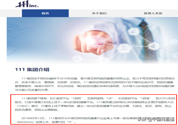 据“111集团”官网介绍,“111集团”旗下拥有B2C医药平台“1药网”、互联网医院“1诊”、B2B医药平台“1药城”,2018年9月12日,“111集团”作为中国互联网医药健康行业赴美上市第一股在美国纳斯达克交易所(NASDAQ)挂牌上市,股票代码“YI”。