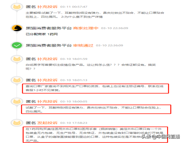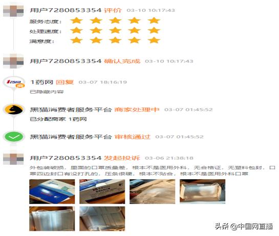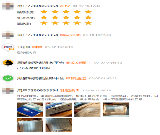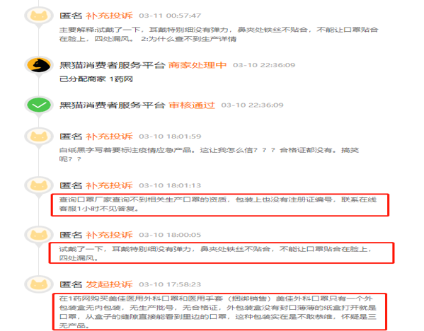 此外,中国网财经记者注意到,在黑猫投诉与“1药网”相关的投诉帖中,有多名消费者提及美佳医用外科口罩“质量有问题、不是医用外科口罩”。