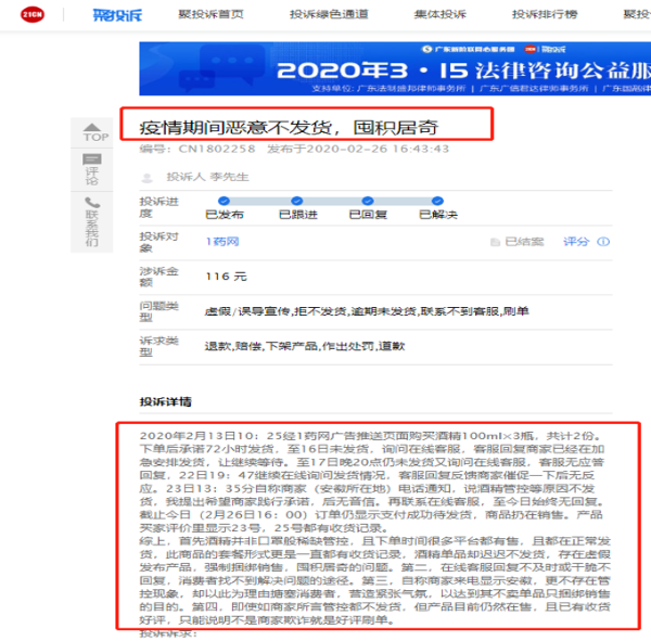 消费者李先生2月20日投诉称,“2020年2月13日,经‘1药网’广告推送页面购买2份酒精(100ml×3瓶)。下单后承诺72小时发货,至16日未发货,询问在线客服,客服回复商家已经在加急安排发货,让继续等待。其后,李先生又分别于2月17日、2月22日、2月23日多次在线询问发货情况,客服无应答或沟通无果。截止2月26日,该订单仍显示支付成功待发货,商品仍在销售。”