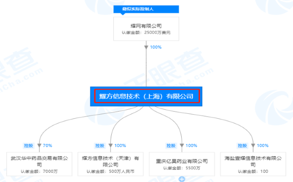 天眼查显示,“111集团”和“1药网”所属公司均为耀方信息技术(上海)有限公司(“耀方信息技术(上海)公司”)。耀方信息技术(上海)公司成立于2013年8月12日,注册资本为25,000万美元,公司经营范围包括计算机软件的开发、设计、制作,销售自产产品,网络技术的开发、设计,自有技术成果的转让,并提供相关的技术咨询和技术服务;食品流通(食品的批发及进出口业务)等。