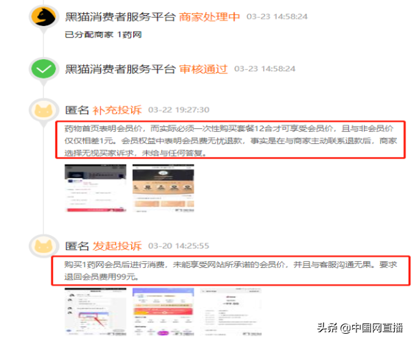 有消费者3月20日在黑猫投诉发帖称,“‘1药网’会员充值系诱导用户消费而并无商家实际承诺功效。购买‘1药网’会员后进行消费,未能享受网站所承诺的会员价,并且与客服沟通无果。要求退回会员费用99元。”