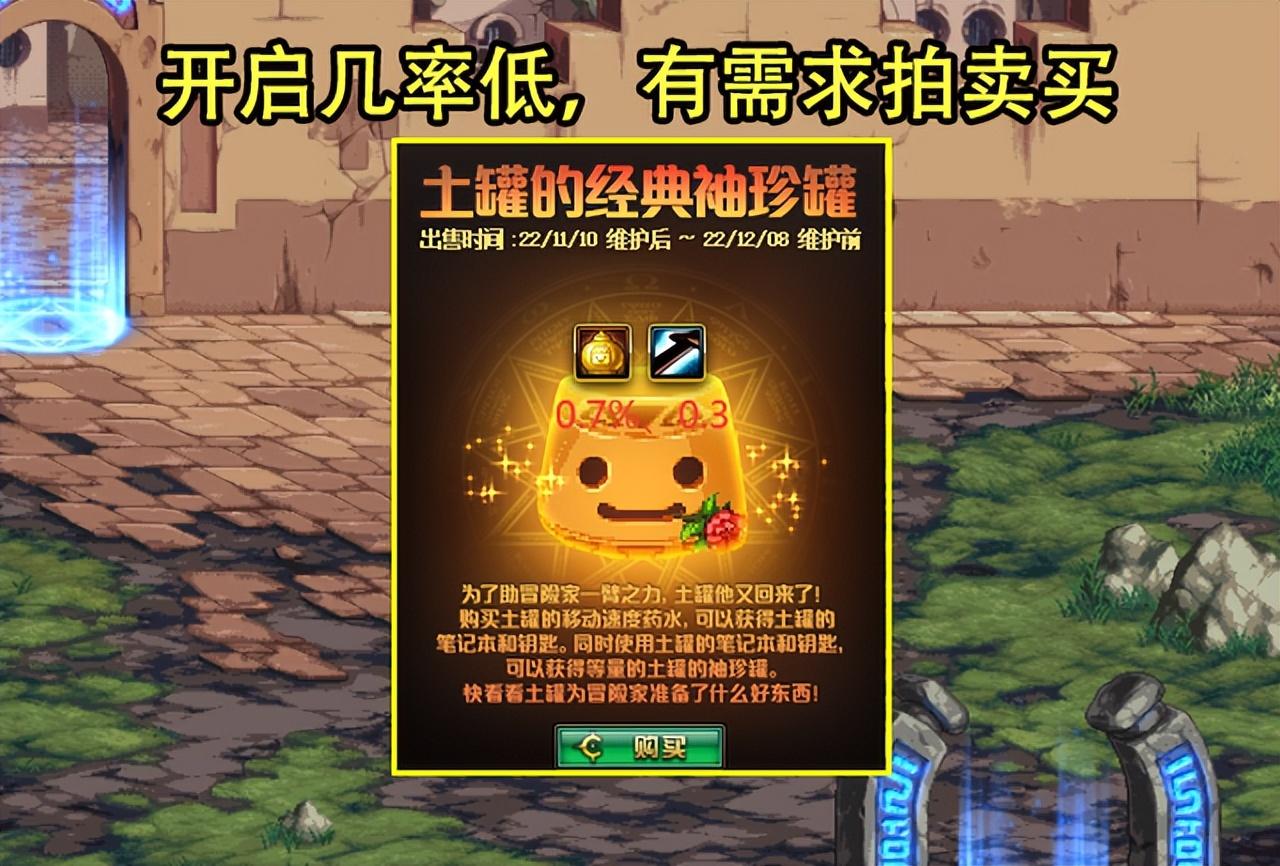 土罐的经典袖珍罐的2大限时到辉金增幅袖珍罐,装备增幅保护券在12.08要删除了,虽说道具要删除了,但是对于想要活动玩家还是不建议开启,道具开启后均是账绑的,如果要获得建议直接拍卖购买,+10增幅券4500W左右,增幅保护券4000W左右,比魔盒开启更划算一些。