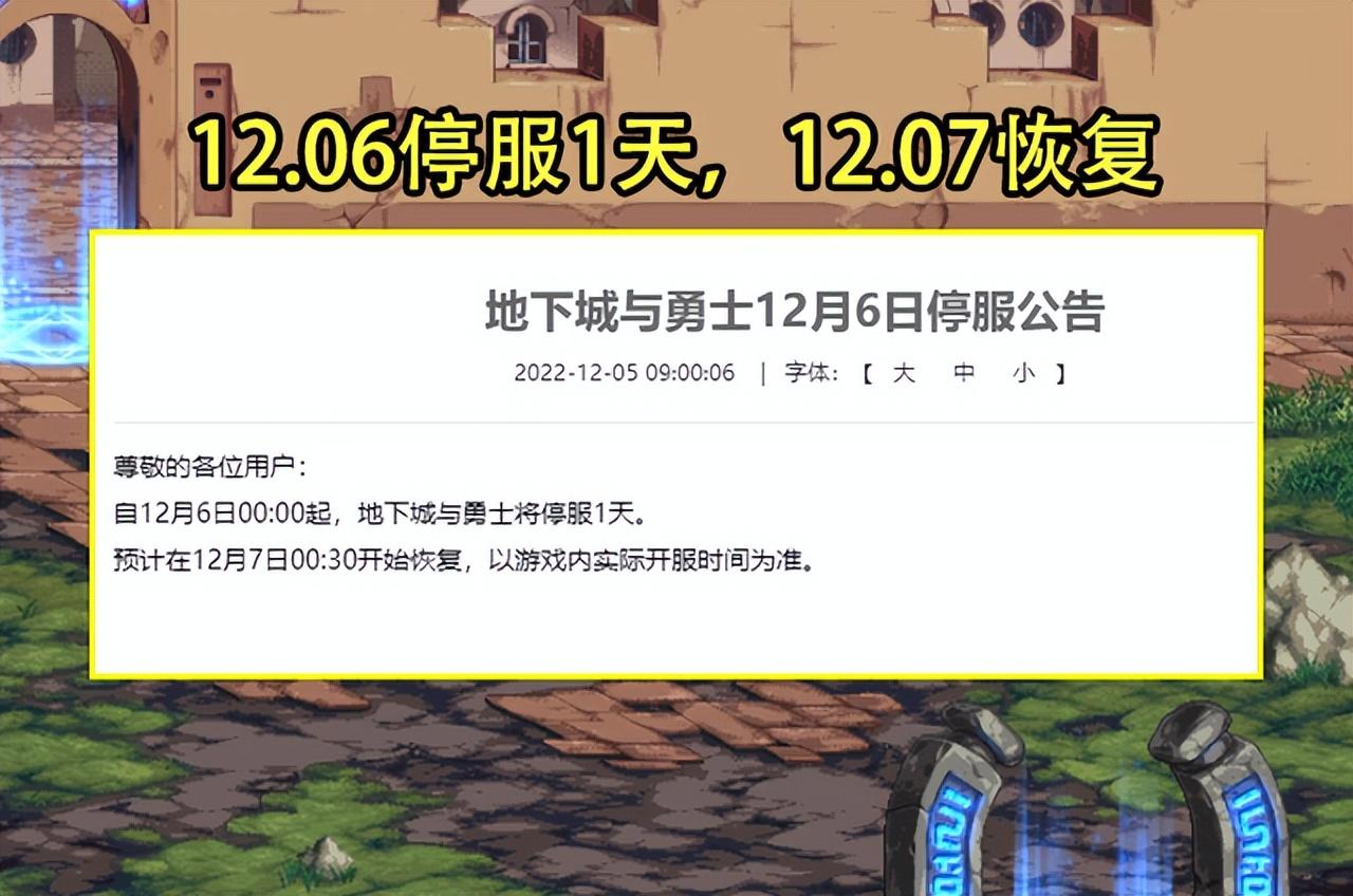 不过就在12.08版本活动上线之前,策划却在12.05发布停服公告了!DNF将在12.06停服1天,预计会在12月7日0:30开始恢复 ,之所以要停服懂的玩家都懂的,不只是DNF,所有网游都停服。