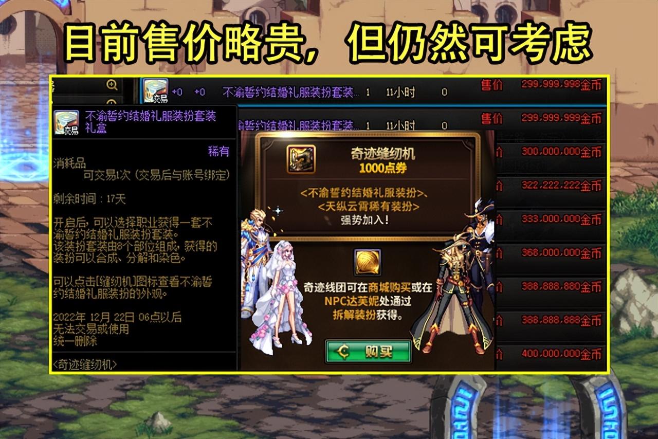 奇迹缝纫机作为暖暖党最喜爱的活动之一,这次加入高颜值时装有很多,例如桑巴套、坐骑套、婚纱套2.0、战灵天舞、黄金套等等,有需求的玩家可以考虑在活动结束前入手一套,不过由于活动快结束,因此价格略高,首次加入的婚纱套2.0已涨到3亿金币,感觉不是很值得。
