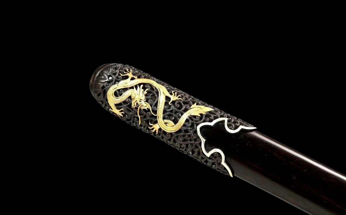 此刀钢刀刃锋,底部一面错银丝横为“地字一号”,纵为“太阿”,另一面横为“乾隆年制”,纵为错金、银、铜丝组成的一人在云月下试刀图案。近銎处以错金银铜丝构成变形云龙纹。护手为铁鋄金圆形盘,镂雕夔龙、火珠、云等纹饰。包饰黄丝绦带,末亦铁鋄金镂刻龙纹,嵌红珊瑚、绿松石和青金石。系明黄丝绦带,饰绿松石珠,两端以铜镀金饰件固定。