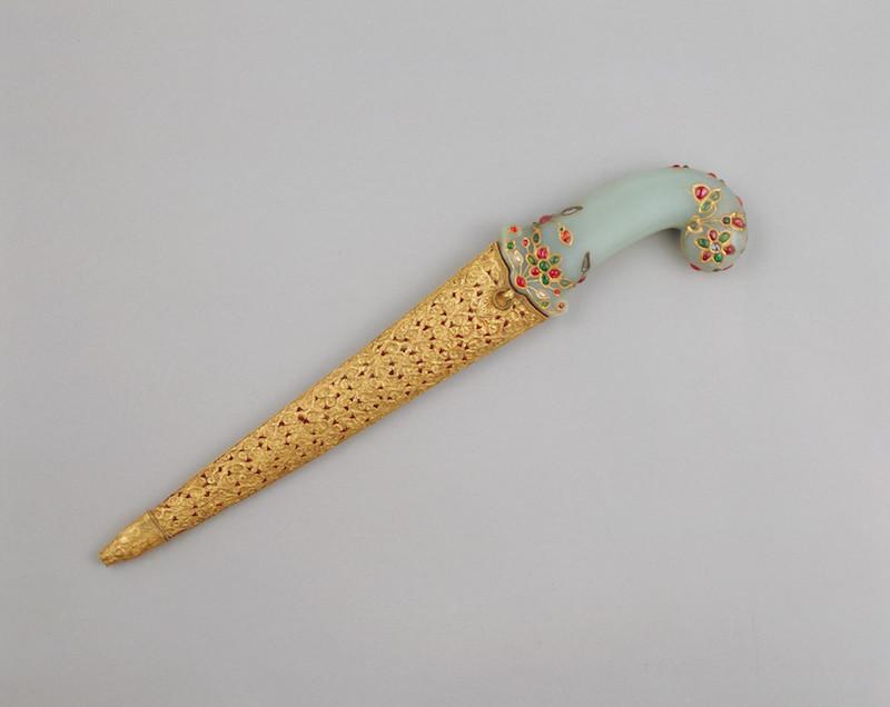 清 玉嵌料石柄铜叶鞘匕首 长45厘米 故宫博物院藏