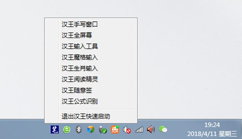 设置完成后,可以由电脑任务栏会点击“双无线大将军”软件快速启动图标,此时会弹出手写输入选项。汉王双无线大将军plus提供汉王手写窗口、汉王全屏幕、汉王输入工具、汉王魔格输入、汉王生肖输入、汉王阅读精灵、汉王随意签、汉王公式识别等多钟手写模式。