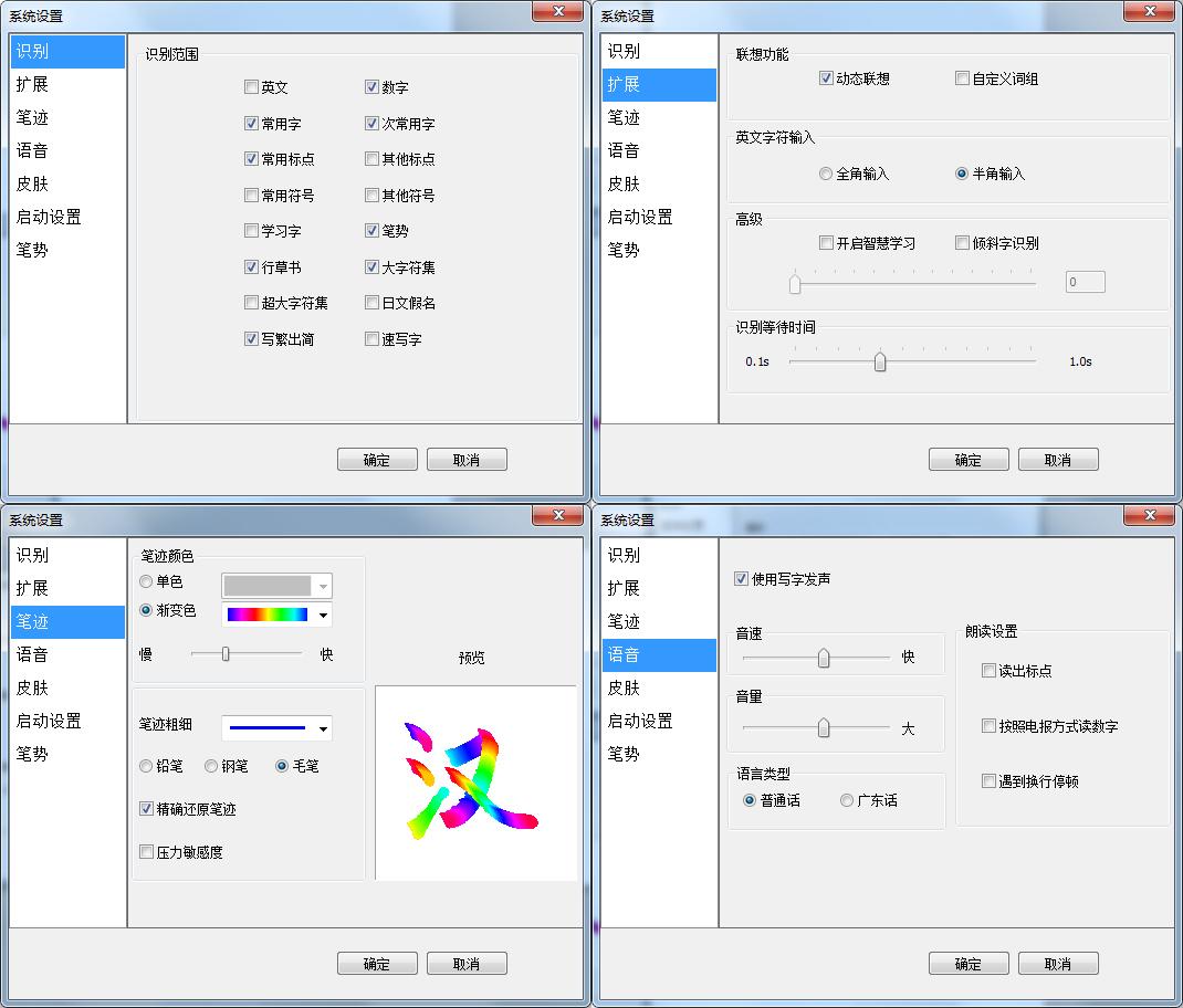 每一种模式都可以对识别范围、拓展功能、笔迹、皮肤等进行个性化设置,并可以启动手写发声功能,在书写输入识别同时,软件可以将输入的内容朗读出来,很人性化的设计。