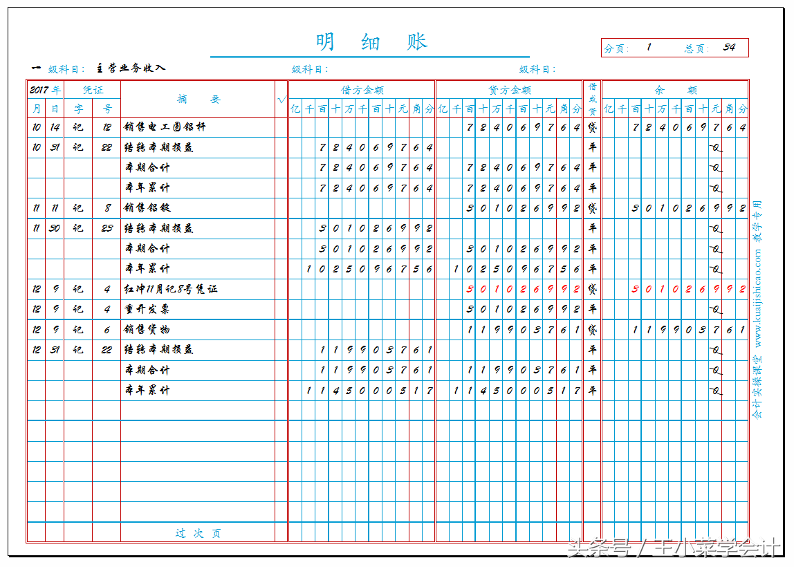 要注意的是,登记多栏账的时候,每一笔业务需要在账页的同一行中登记两次,即先在借方或贷方栏目中登记一次,然后再在具体的专栏中登记一次。如上图,王小菜在登记“应交税费——应交增值税”账户的多栏账时,10月份记10号凭证的业务是购进电工圆铝杆,其进项税额为1,108,935.67元,小菜填写完日期、字号和摘要后,在借方栏目填写了“1,108,935.67”,然后,又在“借方项目”的“进项税额”专栏填写了“1,108,935.67”这一数字,这样该行账的记录才算完整。