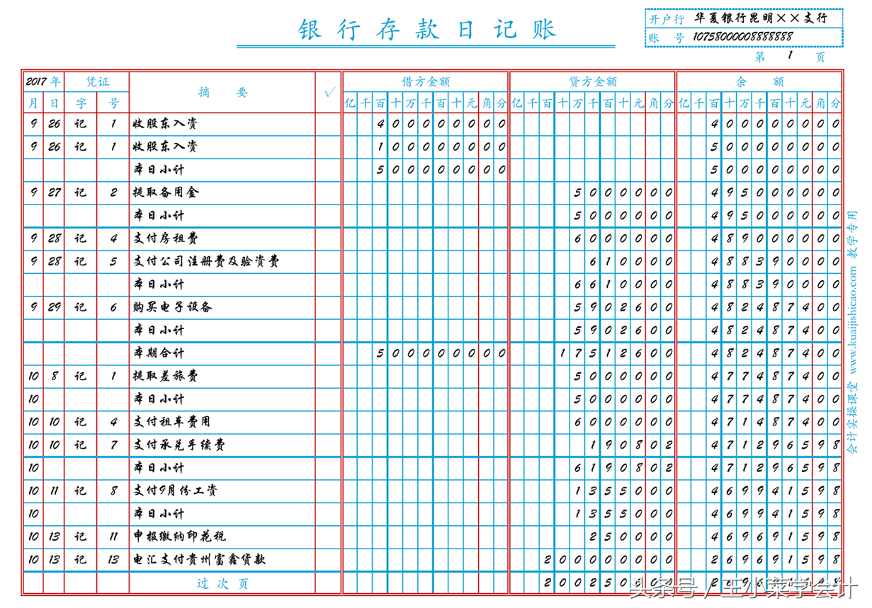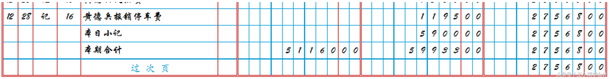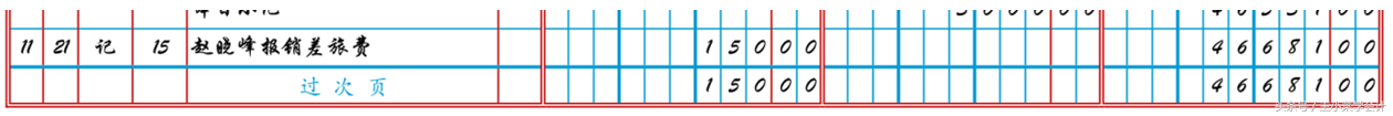 如倒数第二行的内容是一行具体的账目,则“过次页”一行需要汇总本日数额,连同余额一起结转到次页,如下图: