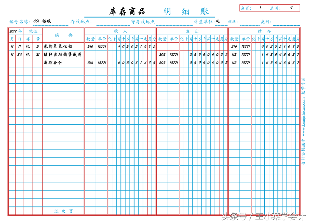 下图是库存商品明细账,属数量金额式明细账。这种账页,也类似于三栏式明细账,只是在记账时,需要同时对收入(或借方)、发出(或贷方)、结存(或余额)分别登记数量、单价和金额三个数字。其中,金额为同一栏目的数量和单价的乘积。