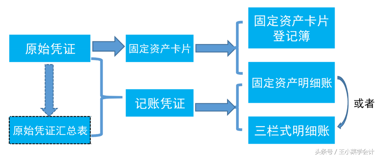 上图是固定资产相关的会计业务事项及其流程。会计或固定资产管理人员根据原始凭证,为每一项具体的固定资产填制卡片,卡片需填制一式二份,一份由固定资产使用部门保管,一份由财务部门保管。因固定资产卡片为活页式,容易遗失,故财务部门需建立固定资产卡片登记簿,对卡片进行集中登记。同时,会计人员应根据固定资产原始凭证填制记账凭证,登记明细账。这里需要注意,固定资产卡片只是非定期地登记固定资产管理信息,并不能代替固定资产明细账。
