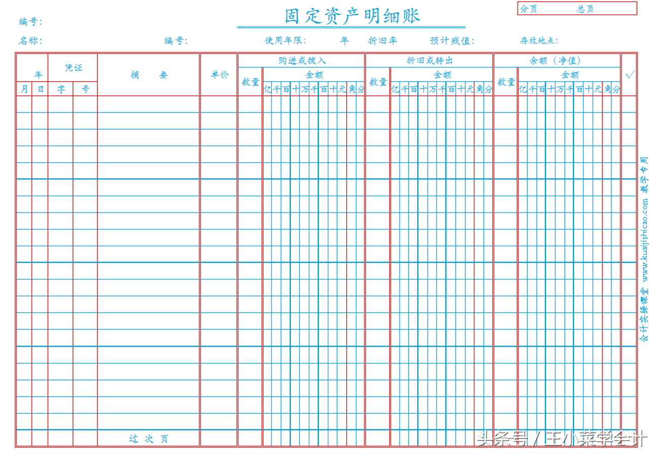 固定资产明细账账页如下图,每一账页可以只登记一项具体的固定资产,也可以按类别进行登记。固定资产明细账账页表头部分比较复杂,除页码之外,还需要对固定资产个体或类别的编号、名称、型号、使用年限、折旧率、预计残值、存放地点等信息进行登记,以便具体量化固定资产的特征。账页表体部分,类似于数量金额明细账,需要对固定资产的单价、数量、金额等信息进行明细登记。