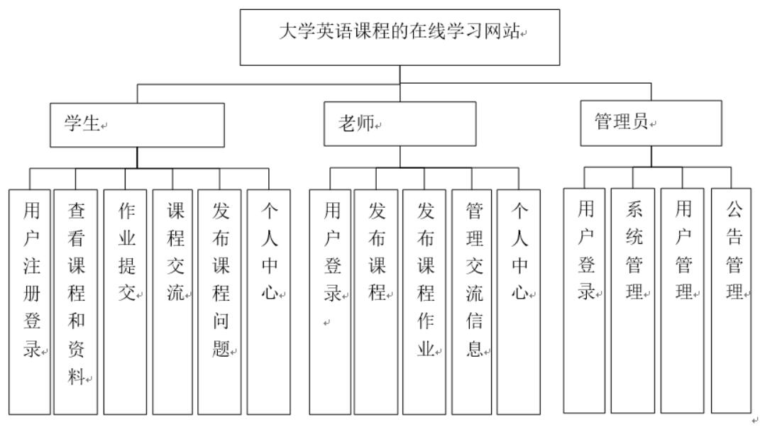 大学英语课程的在线学习网站包括基础信息管理、系统管理、课程资料管理、作业管理、用户管理、学生管理、答疑管理。在用户角色上分为管理员、老师和学生。