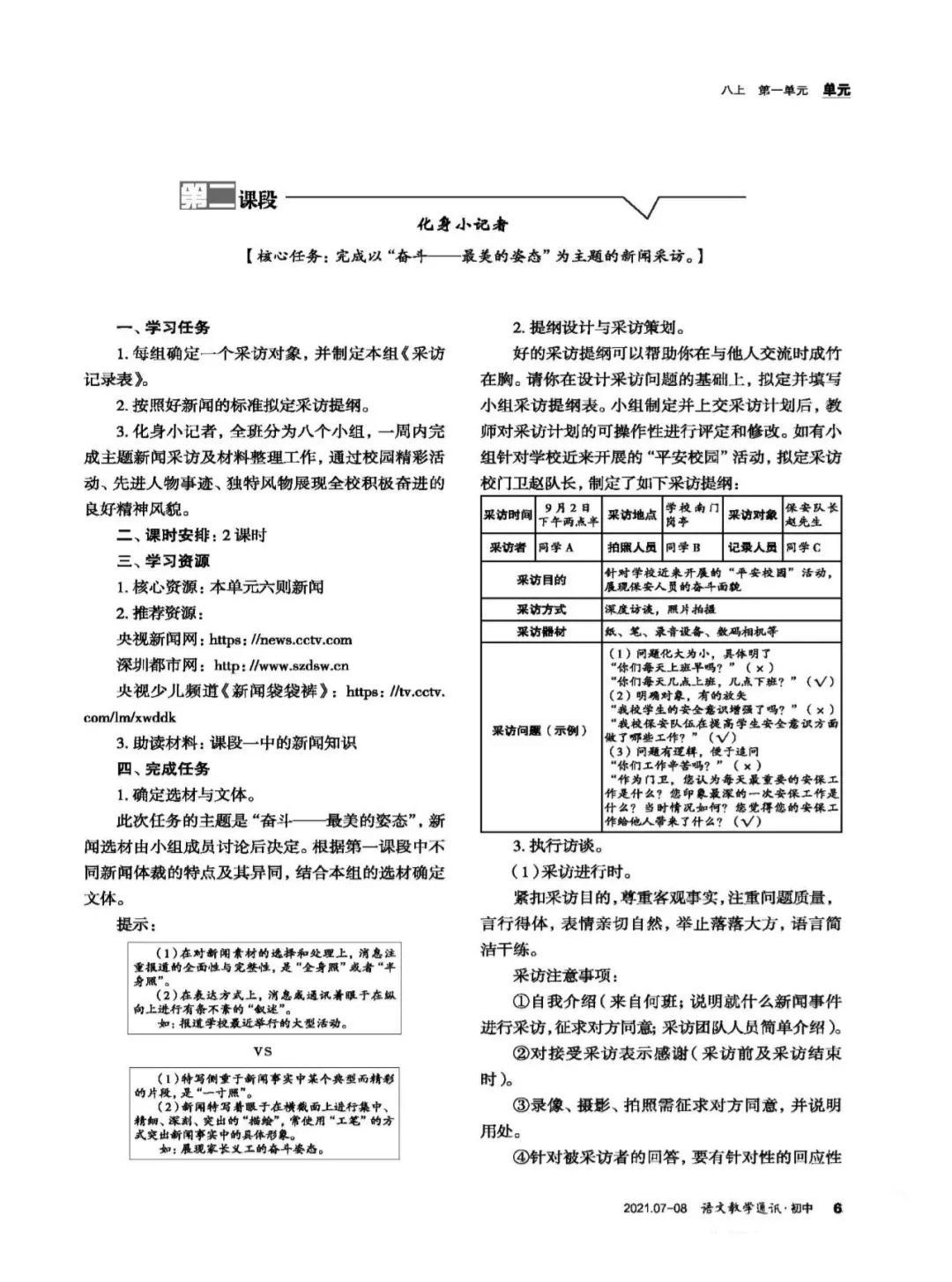 讨论明确:任务第一步新闻阅读,是为了初步把握消息、特写、通讯等不同新闻文体的特点,这样才能根据不同新闻体裁的特点进行相应的写作练习。第二步新闻采访,一方面为新闻写作准备新鲜的素材;另一方面,也可以通过丰富的实践活动,围绕一次语文探究活动,全方位多维度感知各种信息,进行消息、特写、通讯以及新闻花絮等多种文体练习。