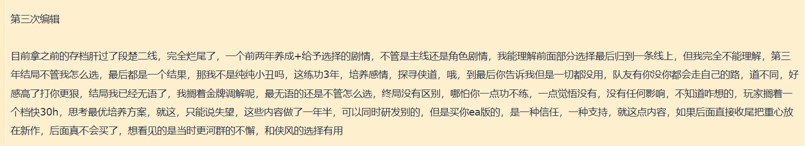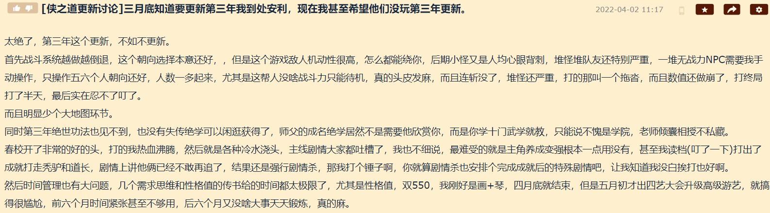 如果专门筛选一下近期玩家评测,会发现差评集中出现在游戏第三年内容的更新后。也就是说,仅仅在1天时间内,《侠之道》就激怒了众多忠实玩家,导致差评如潮。游戏总时长数超过121小时的一位玩家,仅仅用18个字,表达了自己的失望之情。玩家的愤怒是难以言表的,甚至于,在其如今糟糕口碑的影响下,一些还没玩过第三年内容的玩家,也“跟风”给出了差评。