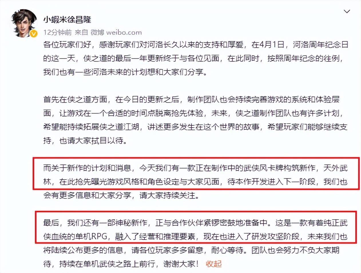 事情并没有就此结束。就在4月1日,河洛工作室发布《侠之道》第三年更新后,同时还公布了一款正在制作的武侠风卡牌构筑新作《天外武林》,以及一款武侠单机RPG神秘新作。这件事,成了激怒玩家的导火索。