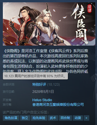 初期的《侠隐阁》,同样没有辜负玩家的期盼。虽然存在众多BUG,战斗系统问题不少,但凭借新颖的玩法、不落俗套的剧情,《侠隐阁》赢得了大部分玩家的认可。2020年5月1日刚刚上线,《侠隐阁》就拿下了93%的好评率,并且自此之后,就没有丢掉特别好评——直到今天依然如此。