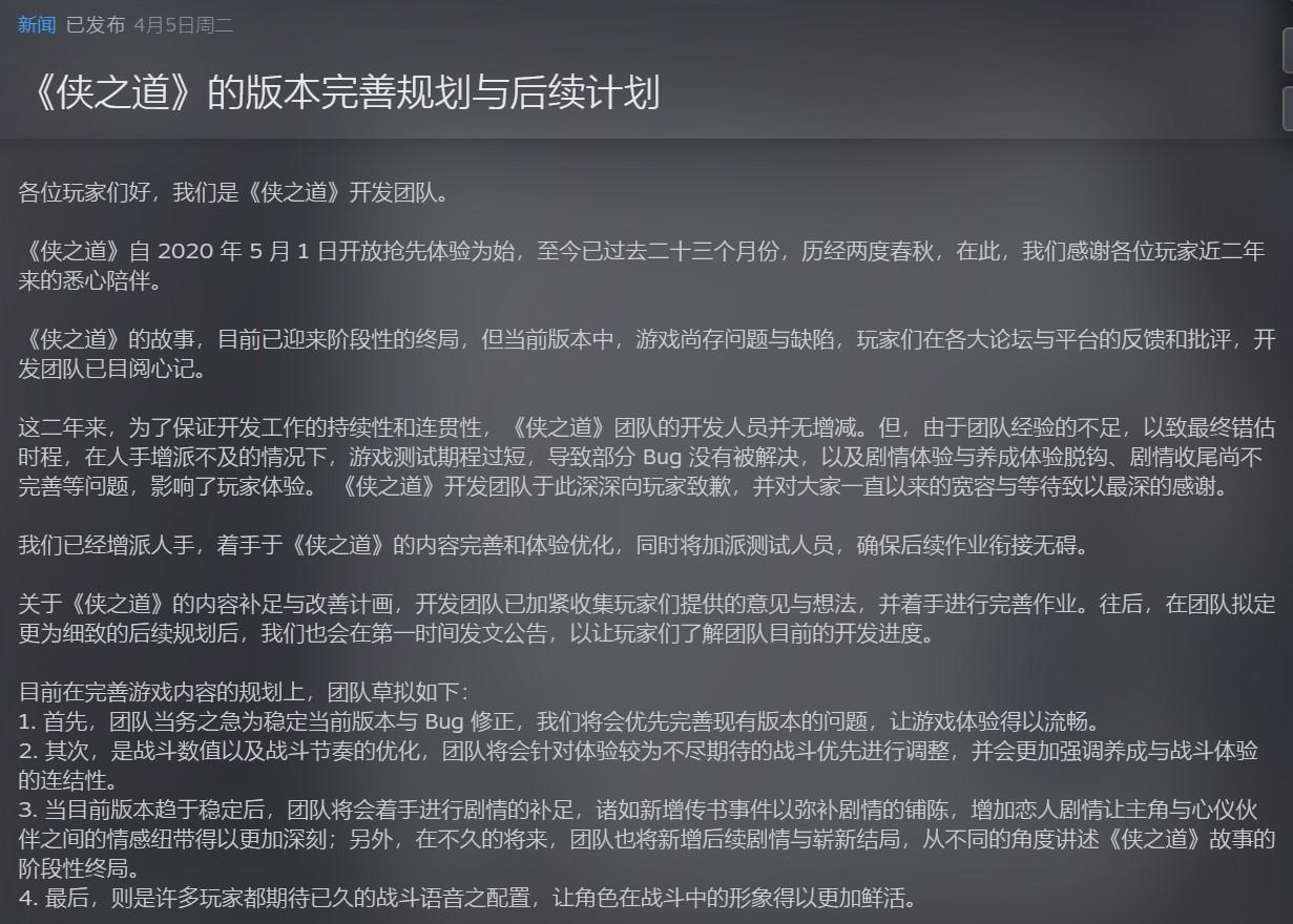 就在玩家的不满情绪持续发酵时,河洛工作室紧急发布了最新的版本完善规划与后续计划。声明中,河洛工作室态度诚恳地向玩家表达了歉意,并收集了玩家的意见以及想法,将在接下来的时间里,重点围绕修复BUG、改善战斗体验、完善剧情等方面进行后续更新。同时,官方宣布将在后续推出免费DLC,以此延续NPC的个人剧情。