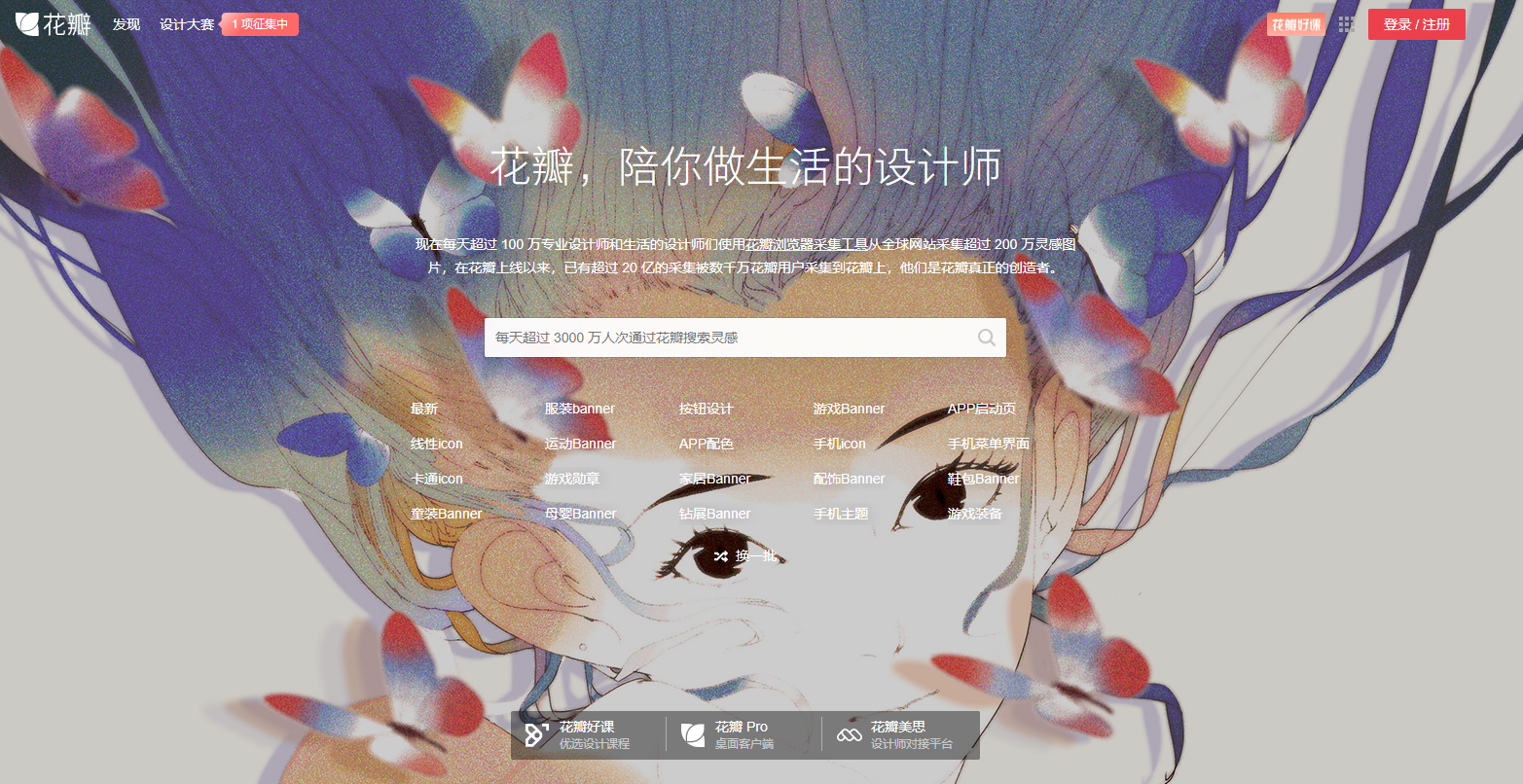 花瓣网,也是设计师经常会逛的网址,素材也比较齐全,作品也多,做设计师的都会经常逛的网站。