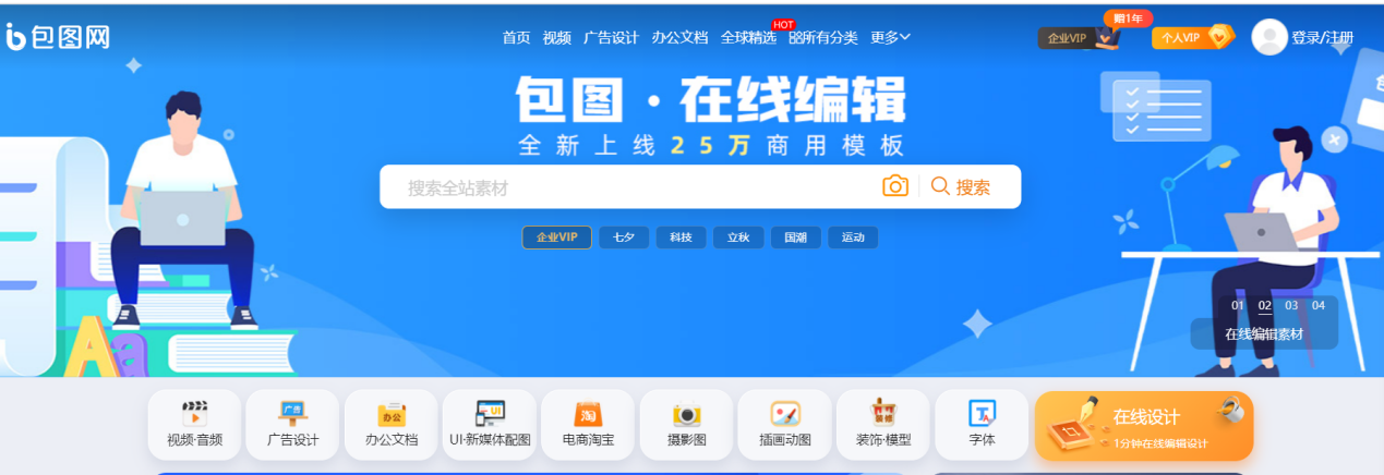 这个网站也是一个很专业的素材平台,几乎涵盖了所有的平面设计领域的多个设计素材:广告设计、UI设计、电商淘宝、插画配图、视频音效、装饰模型、字体,甚至还有办公文档和摄影图。包图网原创度比较高,有独家的设计素材图库,而且整体的更新速度非常快。素材的使用非常方便,可以大大提高设计效率。现在推出了在编辑功能,可以说是设计设的福音,在素材的使用上更加自主。