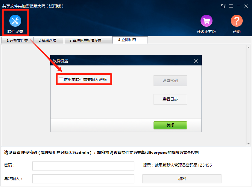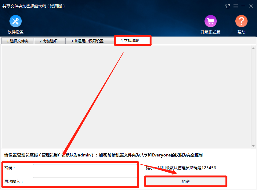 使用方法:在“密码”输入框中设置管理员密码(试用版软件管理员密码是123456),然后再次输入管理员密码,点击“加密”。