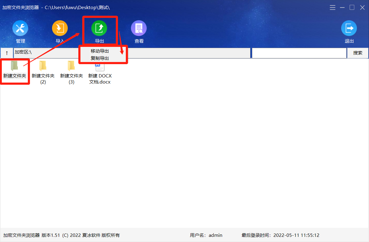 移动导出:导出后原位置的文件(夹)就没有了,相当于剪切。