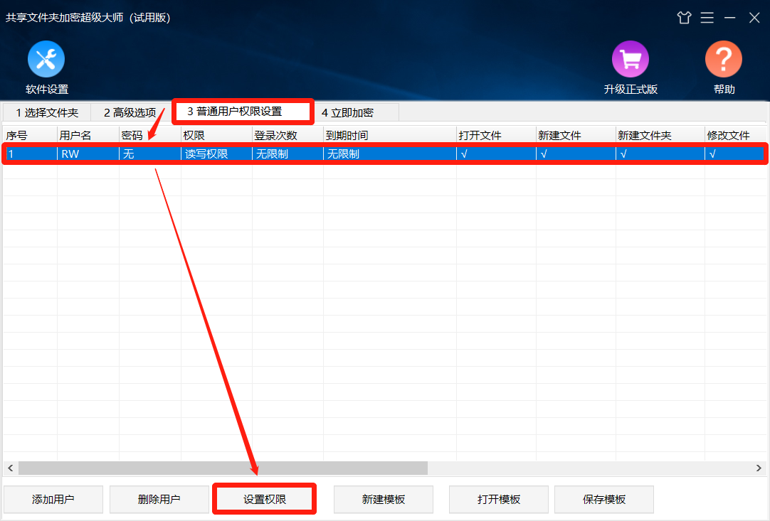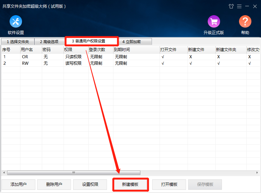 使用方法:在“普通用户权限设置”界面中,如果已经添加用户并设置完用户权限后,点击“保存模版”。