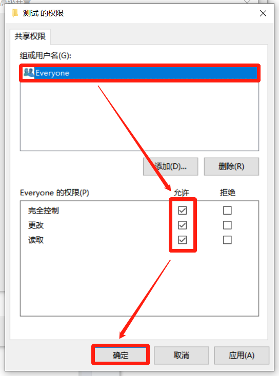 步骤四: 点击“组或用户名”下面的“Everyone”,将Everyone的权限设置为“完全控制”,点击“确定”。