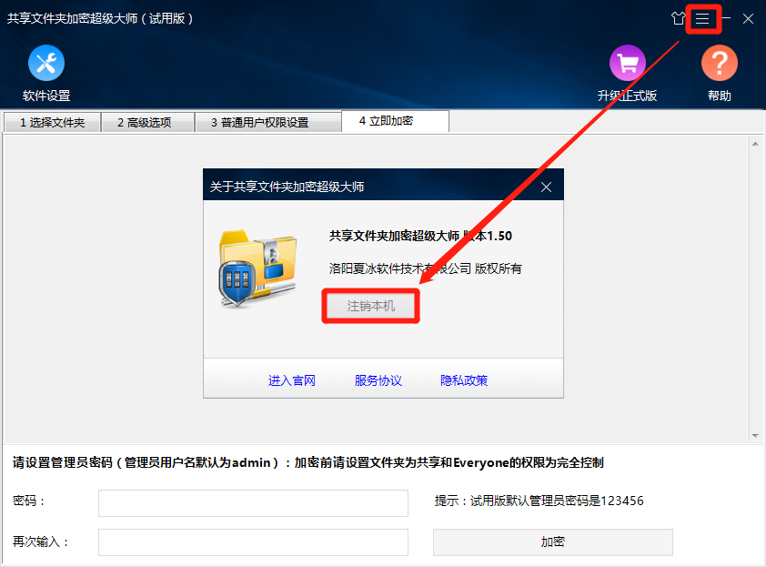 使用方法:打开共享文件夹加密超级大师软件,点击软件窗口右上角的第一个菜单按钮。在弹出的菜单上选择“关于共享文件夹加密超级大师”,然后点击“注销本机”。