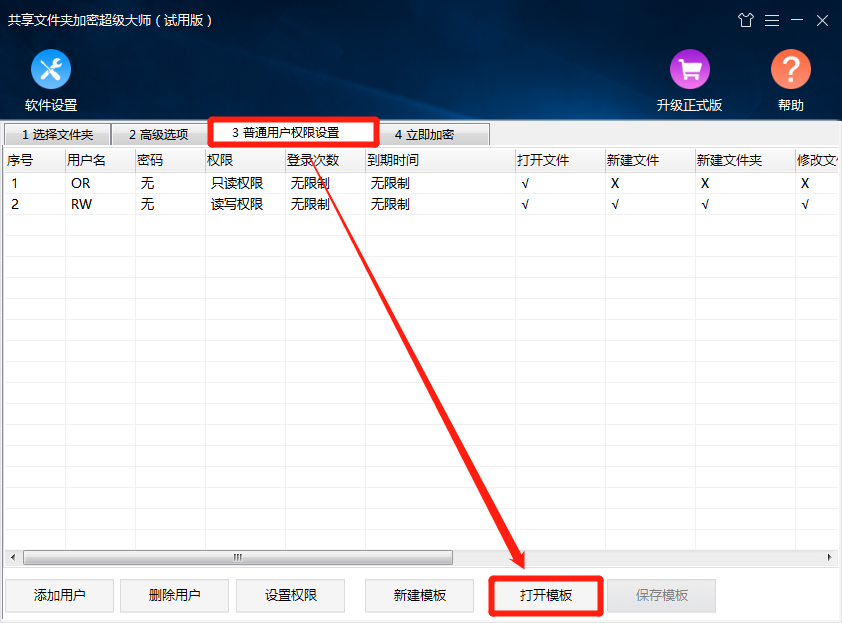 使用方法:在“普通用户权限设置”界面中,点击“打开模版”,在弹出的窗口中选择需要导入的模版文件,点击“打开”即可。