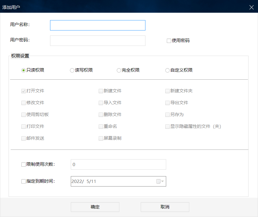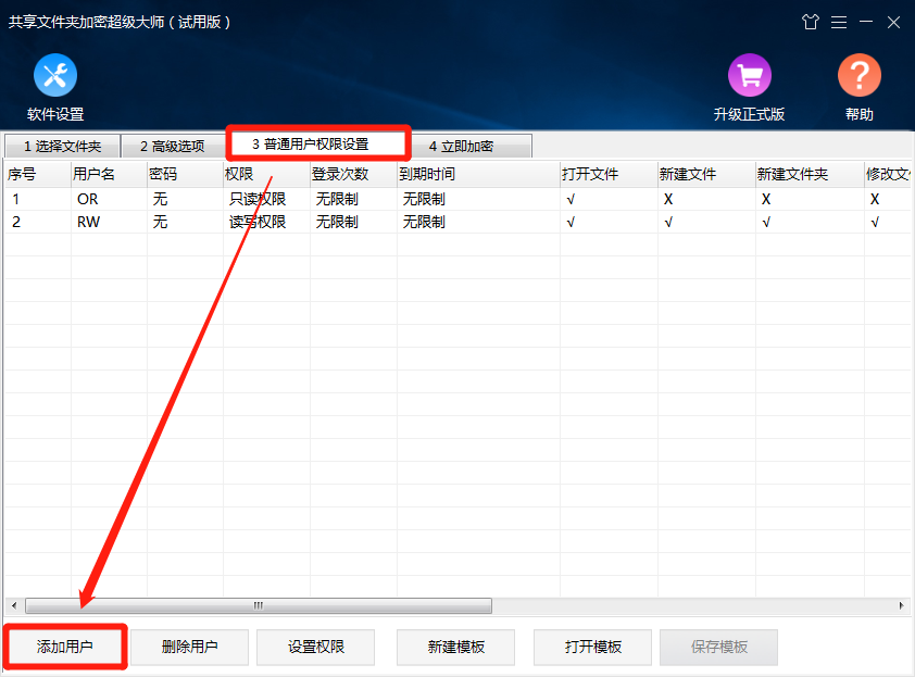 使用方法:添加文件夹或磁盘后,点击“普通用户权限设置”,在弹出的窗口中点击“添加用户”,设置用户名称和密码(试用版软件无法启用用户密码),然后在“权限设置”中设置用户权限,另外也可以限制使用次数和指定到期时间,然后点击“确定”。