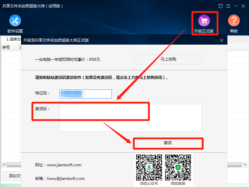 方法二: 进入软件,点击主窗口右上方“升级正式版”按钮,在弹出的“升级到共享文件夹加密超级大师正式版”窗口,复制粘贴激活码到“激活码”后面的输入框中,点击“激活”。